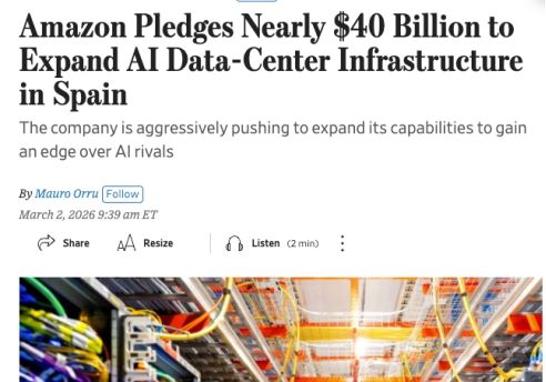 3月3日消息,据华尔街日报报道,亚马逊最新承诺,到2035年将投入337亿欧元(约合398.2亿美元),用于加强其在西班牙的AI数据中...
