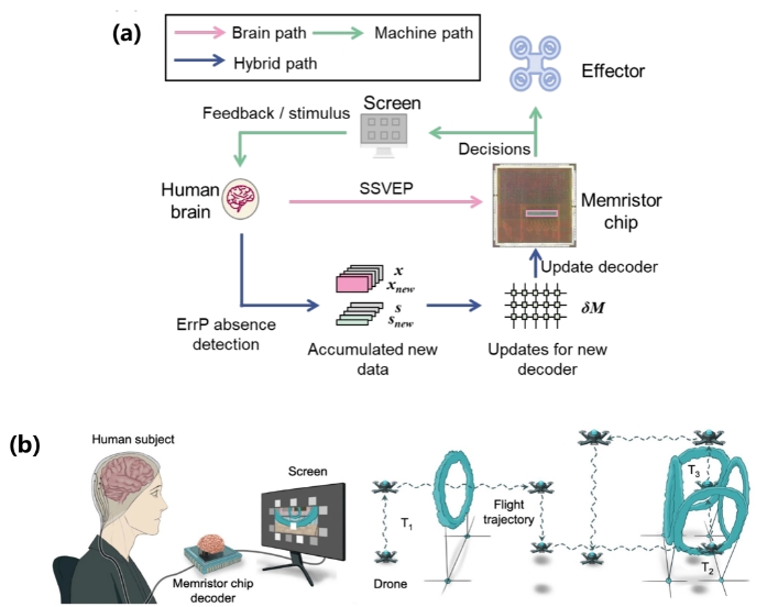 记者17日从天津大学获悉,该校脑机海河实验室和清华大学集成电路学院联合,开发出一款基于忆阻器神经形态器件的“双环路”无创演进脑机接口系统。同时,团队还首次揭示了大脑电信号与解码器在交互过程中如何进一步协同增强的奥秘,并成功实现了人脑对无人机的高效四自由度操控。相关成果刊发在国际学术期刊《自然·电子》上。